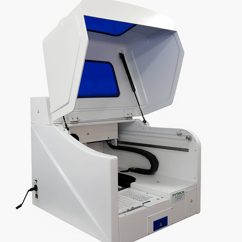 This machine performs all the steps in a fully automatic manner. It should be noted that this device has a maximum capacity of 1 plate and performs a maximum of 7 tests with simultaneous protocols.